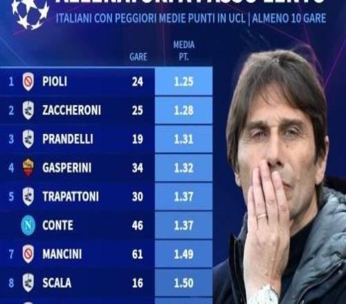 场均1.37分,执教至少10场欧冠的意大利教练中孔蒂成绩倒数第5
